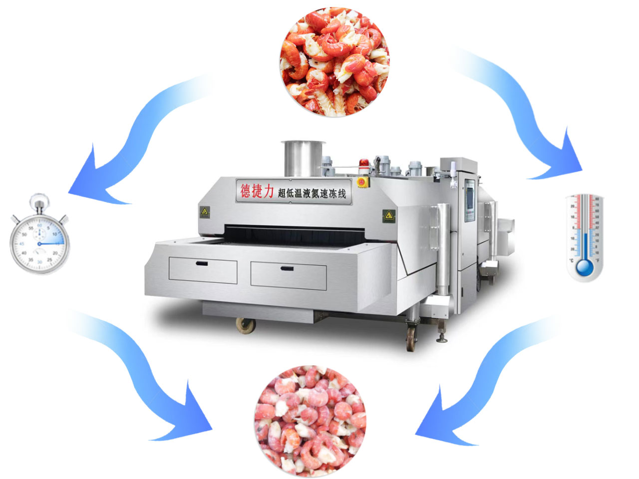 德捷力液氮速凍設(shè)備低溫極限達(dá)-196°C,當(dāng)預(yù)凍品接觸超低溫速凍設(shè)備后迅速氣化,就能瞬間帶走凍品表面熱量進(jìn)行熱交換。